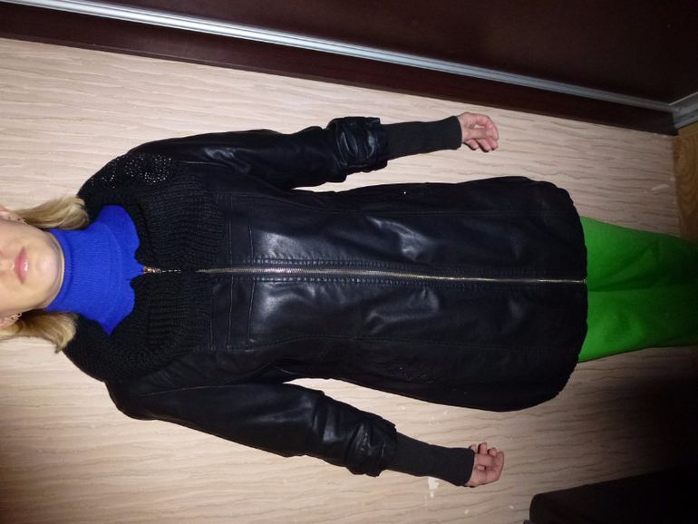 13. Кожаная куртка р-р 42-44 в отличном состоянии (на спине в кольцах стразы, переливаются), одевала до, во время и после беременности до 7 мес. - 3000 руб.