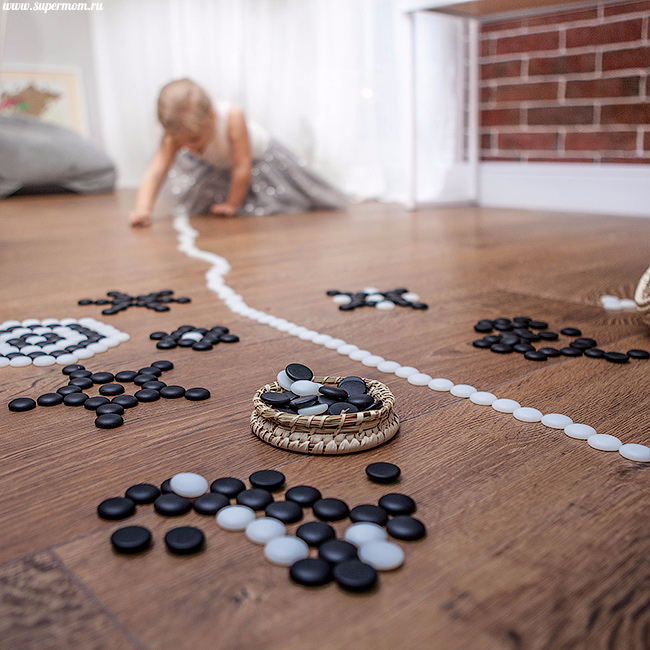 Недавно мы нашли фишки для игры в го, про которые давно забыли. До го нам еще далеко, а вот выкладывать из них узоры и дорожки - самое то.