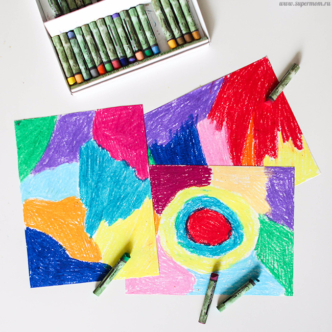 Подготовка: яркими восковыми мелками или масляной пастелью жирно закрашиваем лист бумаги. Мы брали половинки А4, Алиса с удовольствием приняла участие в закрашивании.