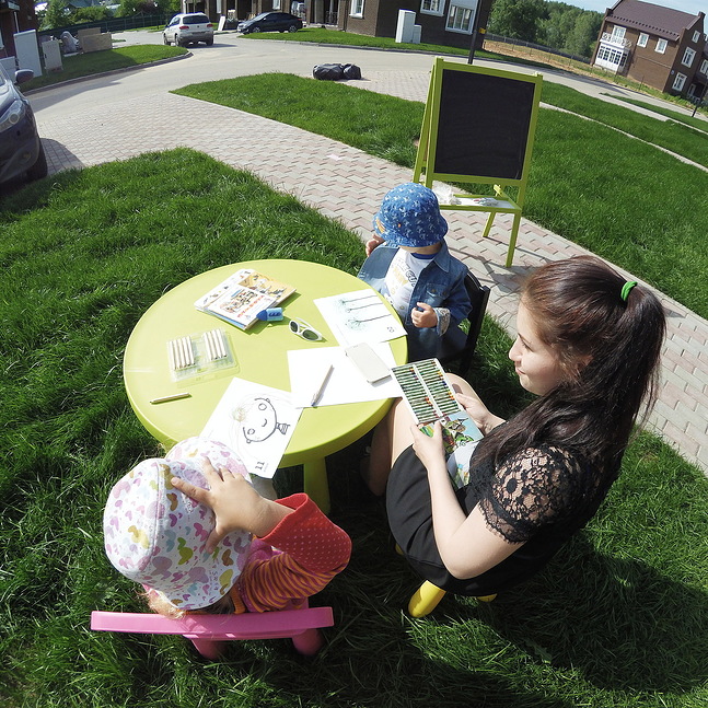 А пока мы организовали мини детский сад на лето прямо дома с воспитательницей из их садика, и она занимается с ними на свежем воздухе, водит гулять, а я придумываю разные игры малышне и по утрам делаю с ними упражнения из блока Шичиды.