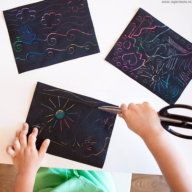 Еще мы попробовали рисование в технике граттаж, то есть процарапывание рисунка через верхний слой.