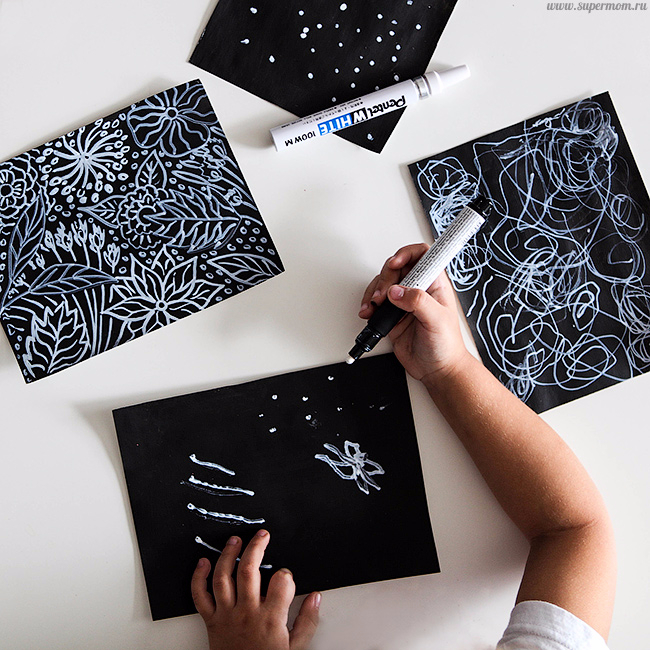 Мы для себя открыли новый интересный способ рисовать - инверсией. Я раскрасила плотные белые листы черной акриловой краской и мы рисовали узоры белыми маркерами. Казалось бы, так просто, но увлекло надолго. Если захотите повторить, то сразу скажу, что краска должна быть именно акриловой, чтобы создавала на листе тонкую непромокаемую пленку, обычные черные листы не подойдут, они сразу абсорбируют в себя всю краску.
