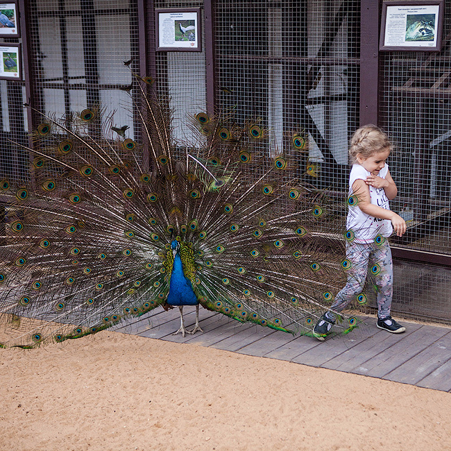 По территории совершенно свободно гуляют павлины, цесарки, утки, никого не боятся, выходят даже за границы территории на парковку. Мы попали в брачный период и наблюдали как звонко павлины трясли хвостами перед своими самками, и все это прямо перед нами, так близко, что можно подойти и потрогать хвост))