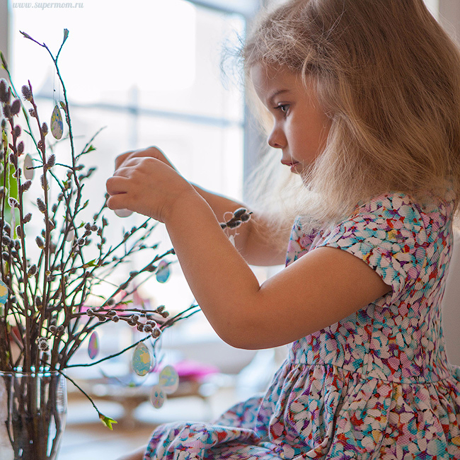 Покажу, как мы украшали дерево на Пасху. Яички сделали из бумаги, на которую с помощью молока и гуаши нанесли рисунок, как я показывала вот здесь.