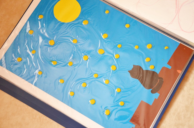 А моя и ее самая любимая картина - "Котик смотрит на звезды ночью" Таких картин мы делали несколько. Я наклеивала на синий картон аппликацию из дома и котика, а Настя делала "звезды". Часть картин подарил бабушкам на Новый год.