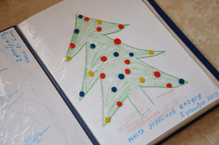 2. Уговорить ее сделать какой-нибудь "шедевр" удалось к 1 году и 6 месяцам. Тогда мы очень много лепили с помощью придавливания маленьких пластилиновых шариков пальчиком. Самая первая работа - украшение елочки