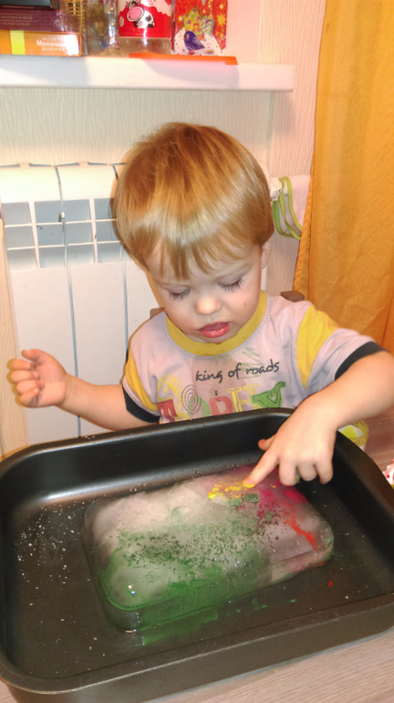 Итак, был заморожен брусок льда, ребенку была выдана соль и краски с кисточкой. Краски мы решили попробовать разные - пальчиковые, акварель и гуашь. Пальчиковые размазывались просто, акварель не очень яркая, а вот гуашь - самое то! ВНИМАНИЕ! для тех, кто не в курсе - гуашь плохо отмывается, поэтому осторожней с ней, но эффект превзойдет ожидания ребенка.