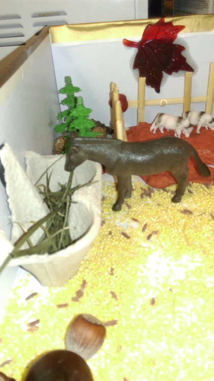 Лев сначала очень долго просто смотрел на ферму и не знал, что с ней делать. только показывал на животных и говорил кто это. Потом разыгрался - очень ему понравилось курочек кормить, лошадок, купать свинюшек, месить грязь вместе с копытными.