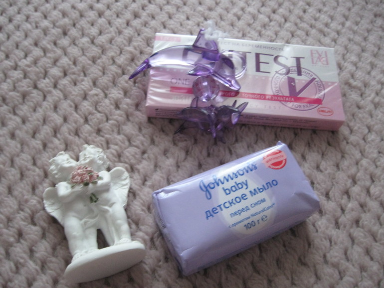 Тест на беременность, детское мыльце, два очаровательных ангелочка и дельфинчики на счастье