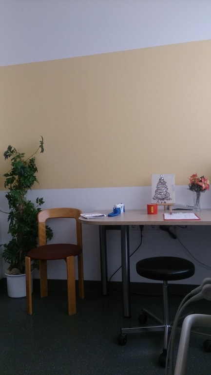 на осмотр. Очень тут милые все :) Медсестра хорошо говорит по-английски. Спросила, на каком языке мне проще всего, рассказала, что у них есть русская акушерка. И, может, мне повезёт и она будет на моих родах ;) Как чудесно - никто не пугается, что у меня прошёл ПДР, все расслабленно улыбаются. Положили на КТГ на полчаса и потом будет УЗИ. Пока лежу, измерили давление и температуру. Надеюсь, на УЗИ будет все хорошо. Вид с кушетки :)