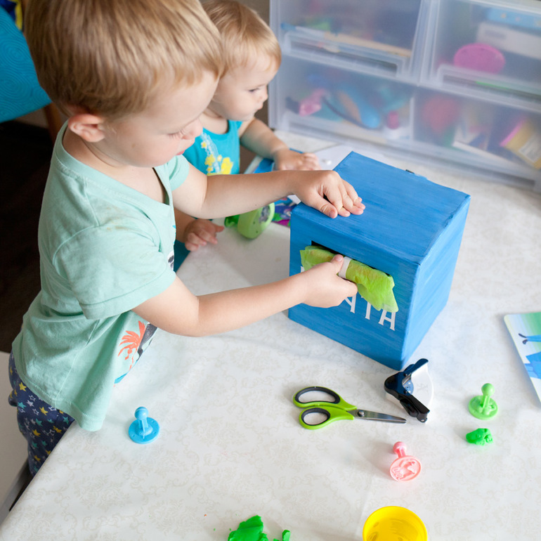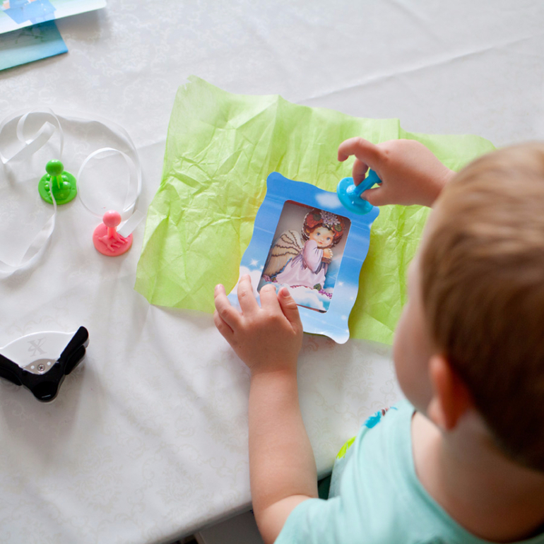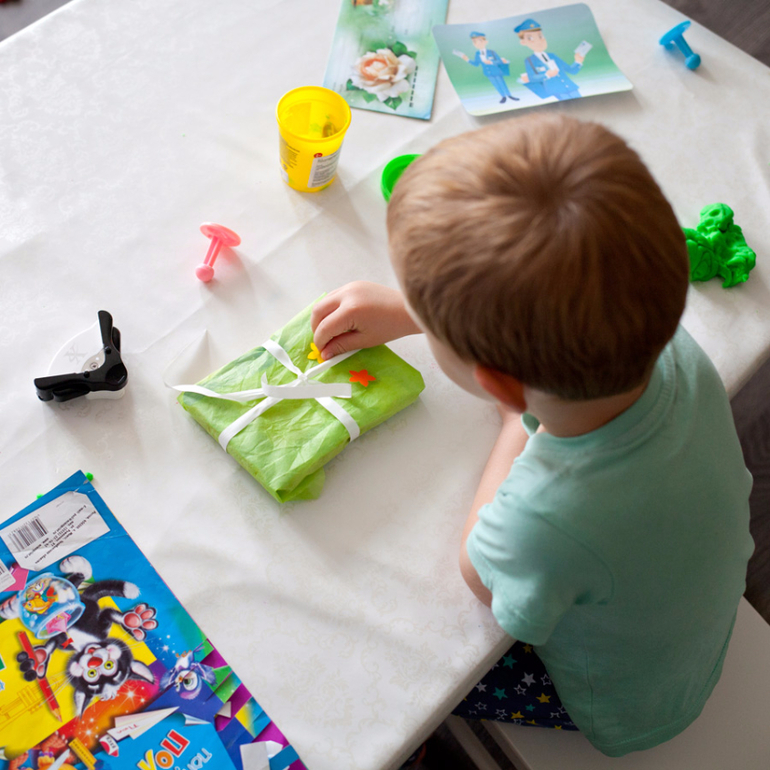 Затем Ваня был в роли отправителя посылки. Мы заранее собрали объемную открытку для бабушки и решили ее упаковать. Я завернула ее в оберточную бумагу и завязала ленту, а Ваня украсил посылку цветочками и поставил печать из пластилина.