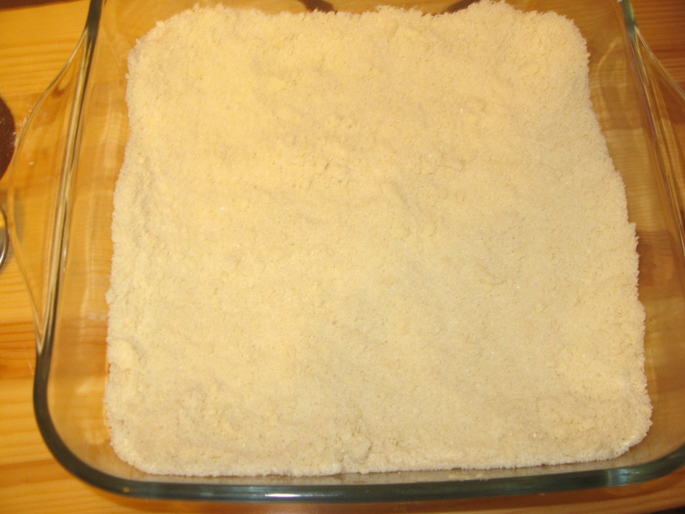 Просеять муку с разрыхлителем, добавить сахар, корицу, масло ( тут на ваш выбор, можно натереть замороженное на терке ил порубить ножом). Выбираю последний вариант и перетираю руками в однородную крошку.