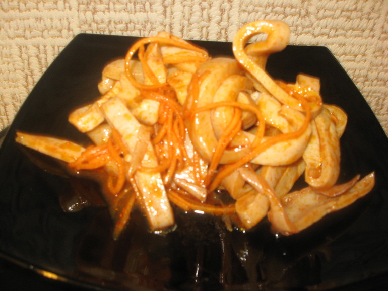 Очищенные кальмары бросить в кипящую подсоленную воду на 30 секунд!