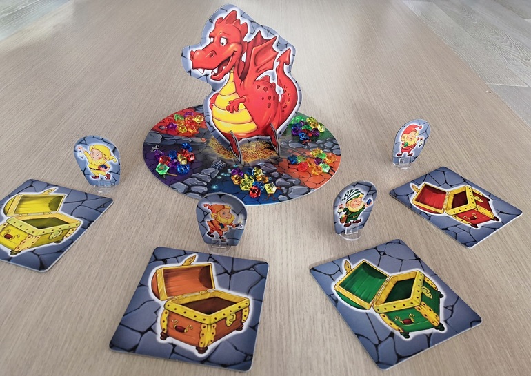 После того, как сходят все игроки, бросается кубик за дракона. Дракон поворачивается в том направлении, куда указывает цвет на кубике. Если на этом секторе есть гном, то он в страхе улепетывает из пещеры и теряет все сокровища, что у него в кармашке. До сундука дракон добраться не может.