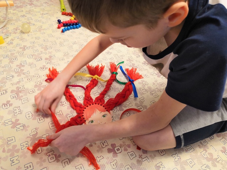 Дочек у меня нет, поэтому не знаю, умеют ли девочки плести косички в 4 года (игра рекомендована с этого возраста). Мальчишки точно не умеют. Младшему я плела сама. А вот старший оказывается может)