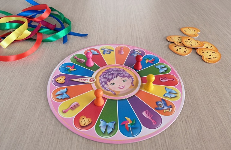 Были у меня опасения, что игра окажется затянутой: заплети косичку, расплети косичку, заплети косичку, расплети косичку... Но к моей радости они не оправдались. На игровом поле всего 3 вертушки против 5 расчесок и 5 бантиков.