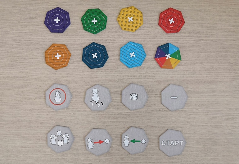 - цветные тайлы, попав на которые, игрок получает из банка пуговицу указанного цвета,