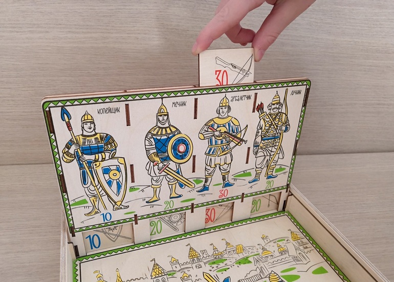 Не все так просто. Обратите внимание, что пазы разных размеров: 30 - самый узкий, 10 - самый широкий. По правилам каждый стреляет (щелкает пальцами по бите) три раза (три биты). У нас этот вариант не прошел, папа в свой ход может выбить 3 из 4 арбалетчиков, приносящих по 30 очков каждый. Папу дисквалифицировать за суперметкость не хотелось, поэтому за переговорным столом было принято решение стрелять в свой ход по одной бите. Это и уравнивает шансы главнокомандующих и уменьшает время ожидания хода.