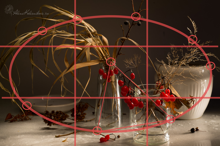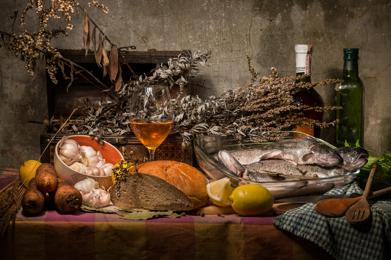 Её нужно обдумать. Какая-то идея должна быть. Для этого нужно вдохновиться и посмотреть в интернете натюрморты, любые. Вспомнить, что какие-то причиндалы типа подносов расписных или кувшинов глиняных у Вас тоже есть. И выложить все устлав рогожкой столик )) Вариантов здесь бесчисленное количество, все зависит от вас. В выкладке, так же работает правило третей, диагонали и все премудрости основ фотографии. Обратите внимание, ваша раскладка должна иметь завершенность, что это значит. С одной стороны, на фото не должно быть ничего лишнего. Но, с другой стороны - должно быть все необходимое для понимания зрителем сюжета и передачи идеи. Все предметы, в едином виде, имеют, как бы, геометрию линий в кадре.