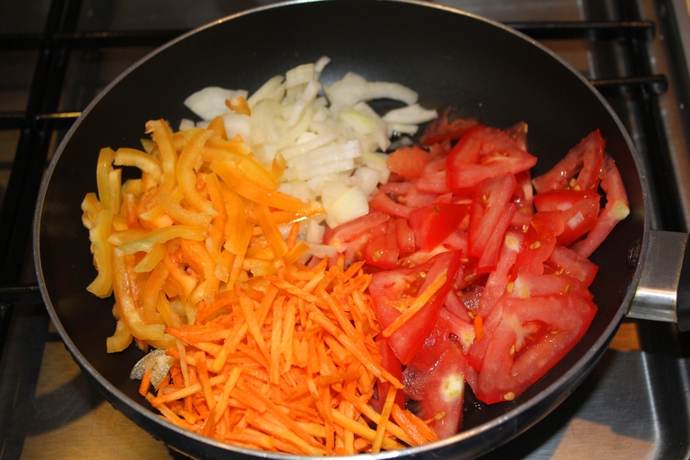 Лук порезать полукольцами, морковь, помидоры и болгарский перец порезать соломкой