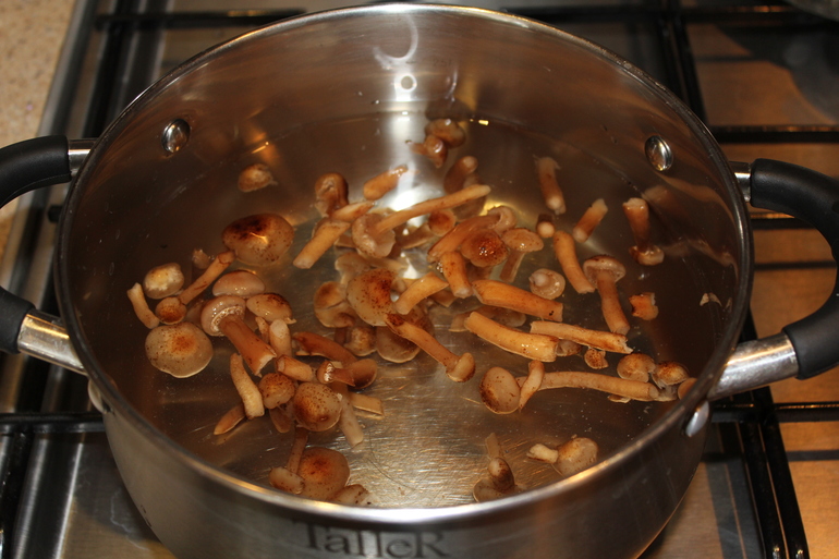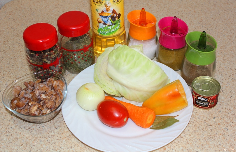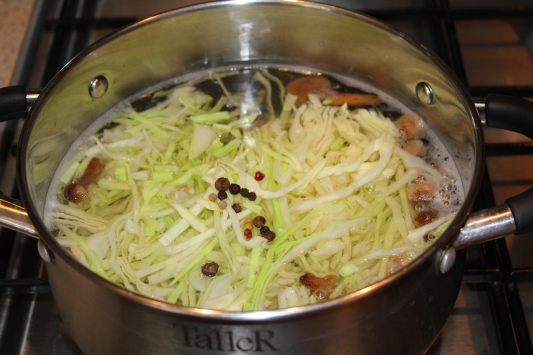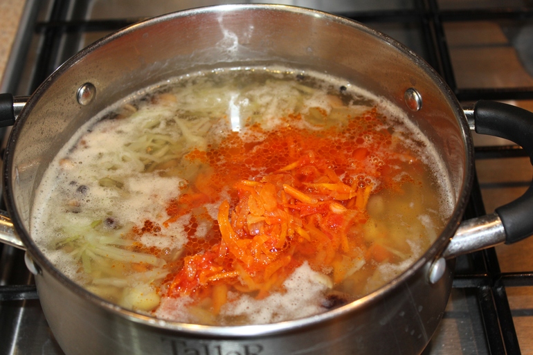 В грибной бульон добавить капусту, смесь перцев горошком, посолить по вкусу