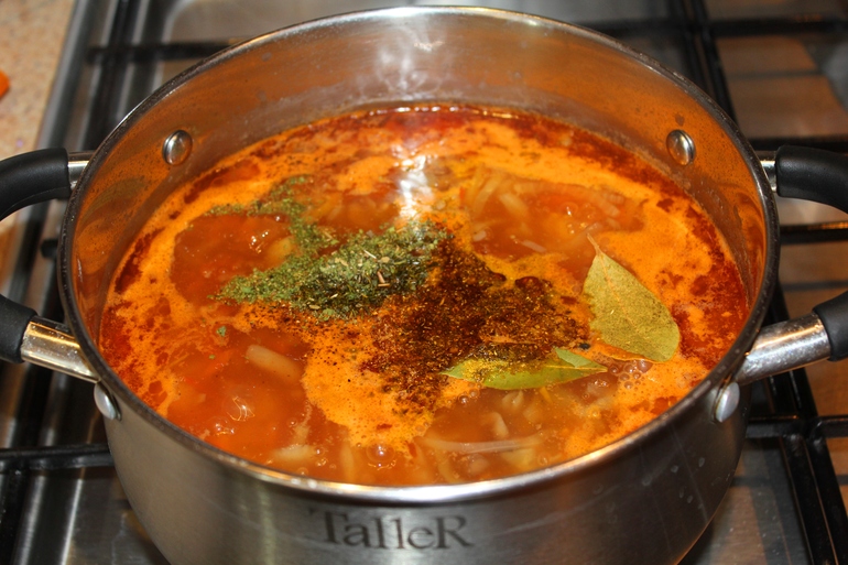 пряную зелень, лавровый лист, хмели - сунели, черный молотый перец, дать прокипеть минут 5 - 10.