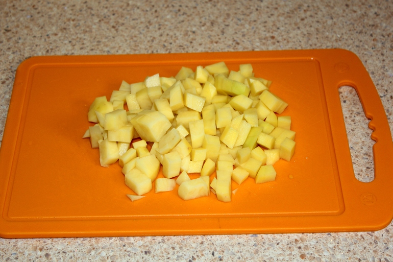 В бульон добавить картофель. Варить на медленном огне в течение нескольких минут