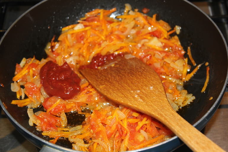 К пассерованным овощам добавить столовую ложку томатной пасты, добавить небольшое количество бульона