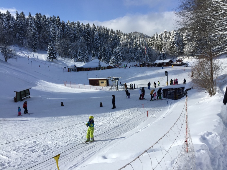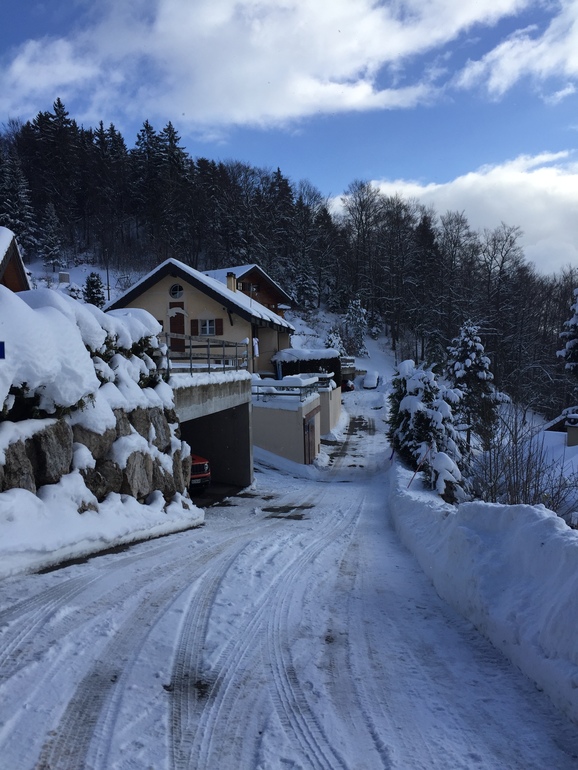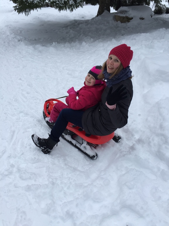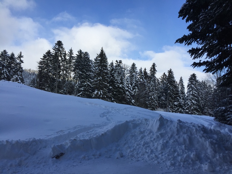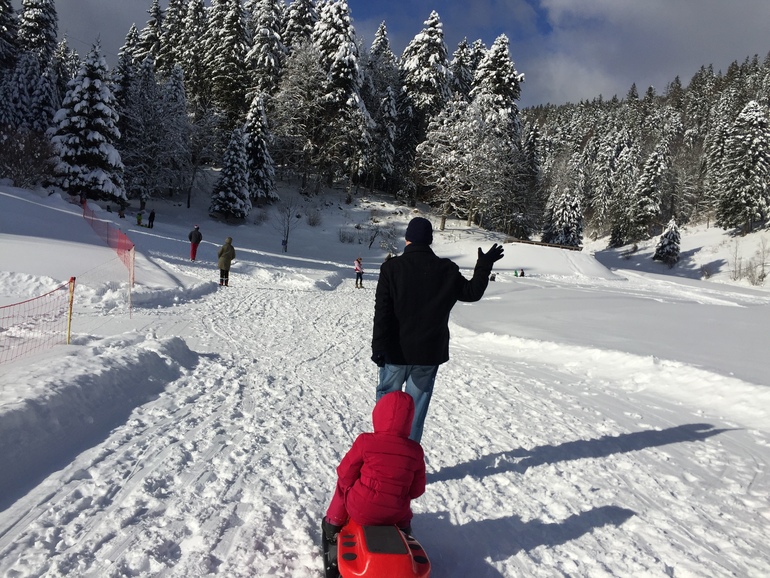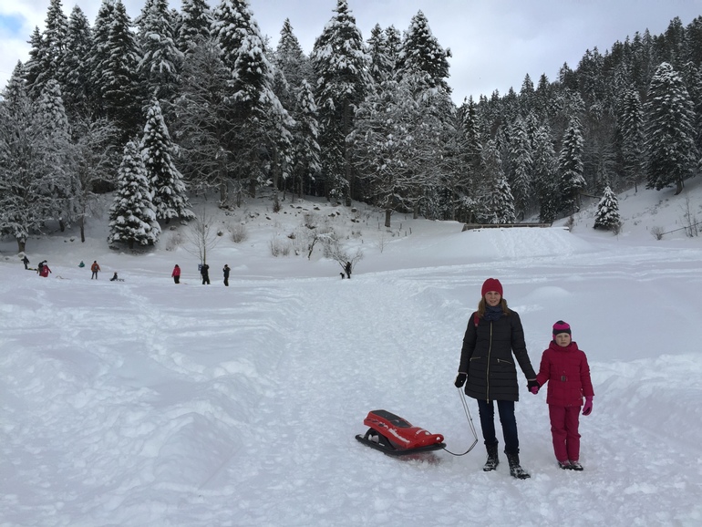 Вот наконец-то и мы побывали в швейцарских горах. В городке Сен-Серг катались на санках. Там столько снега! Даже не верится, что всё это великолепие всего лишь в часе езды на поезде от Женевы. В Женеве снега нет вообще.