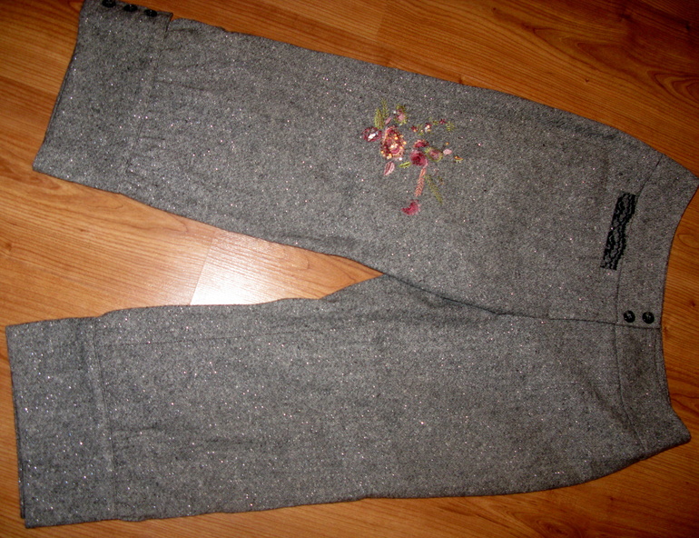 12. Новый комбинезон Melrose размер 42. Подойдет на ОГ 86 см. Ткань стрейч.Цена 1000 рублей13. Новые теплые брюки с люрексовой нитью, длина3/4. Бренд APART. Размер 42 см. На ОТ до 65 см. Украшены вышивкой. В составе ткани 45% шерсти. Цена 900 рублей. Брюки без этикетки. Покупала в три раза дороже.