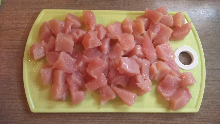 Нарезаем кусками мясо. У меня индейка. Можно взять любое по вкусу.