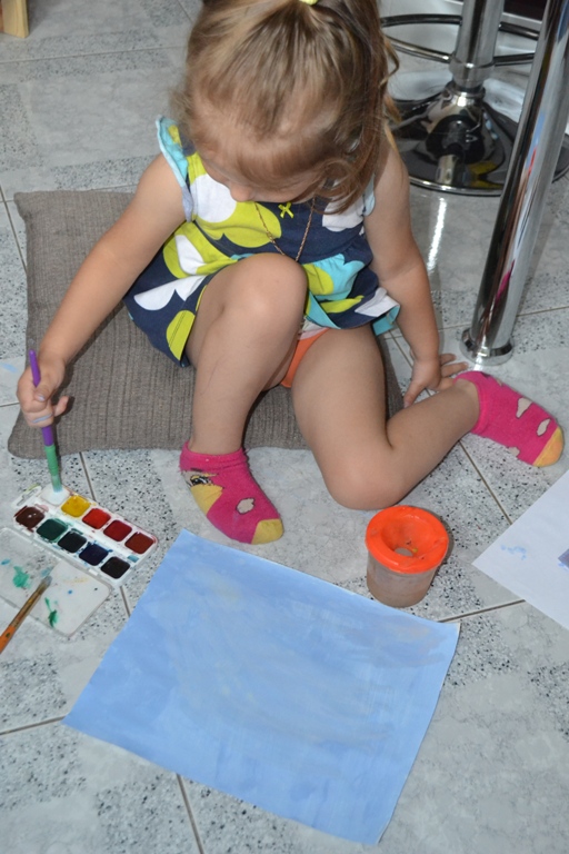 На кануне вечером мы с Настеной покрасили и заморозили водичку. Ведь сейчас зима и наши капельки превратились в лед. Так как красили мы акварельной красой, то особо порисовать у нас не получилось