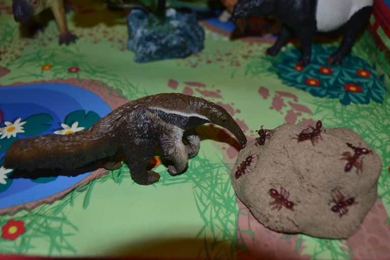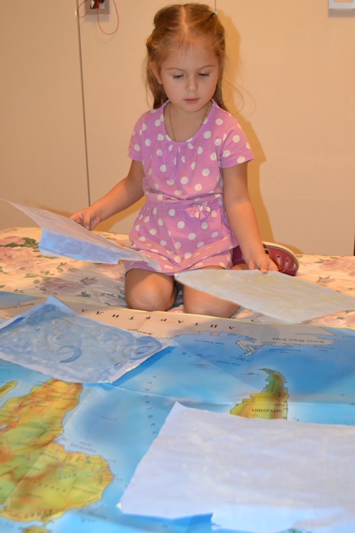 У нас уже стало традицией делать такой мини континент. Вот и на этот раз на скорую руку смастерили. Окапи Настя никак не хотела убирать. Сказала, что она с Африке приплыла в гости к Ламе.