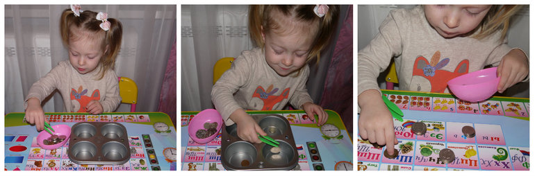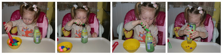 Разными пинцетами складывала помпоны разных размеров в бутылку. Самое сложное оказалось их обратно вынуть.