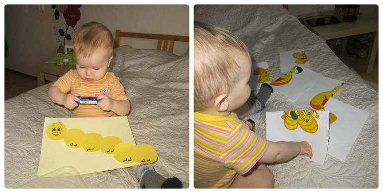 Потом мы собирали гусеницу, а так как клей отобрать оказалось сложной задачей, мы ее приклеили к листочку!))) Картинки посмотрели, пособирали. Я не поняла понравилось ему это или нет