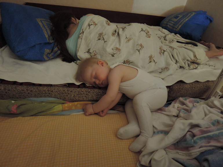 СОН: спит ночами ужасно, просто ужасно....Просыпается миллион раз. Приходится давать грудь. Я надеюсь, что это пройдет после прорезывания верхних клыков, а пока терплю, как могу. Да, спит в кроватке без бортика, придвинутой к нашей кровати. А по факту кочует из кроватки к нам, и обратно всю ночь).