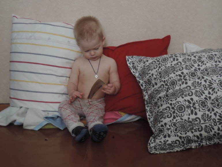 Еще вчера (18 марта) вот что приключилось. У меня есть подушка для беременных. Временно я давала ее попользоваться бабушке. Сейчас она мне вернула. А так как подушка огромная, пришлось завернуть ее в газету и обмотать скотчем. В таком виде временно мы ее поставили в зале на пол. Алеше ужасно понравился новый объект. Сначала он подползал, отрывал кусочки от газеты, осматривал их серьезным взглядом, ну и ,конечно, пытался попробовать на вкус. Я, как могла, старалась эти попытки пресекать.