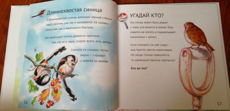 Эта серия книг для самых маленьких у нас из нее еще и Букашки есть. Эта скорее для Феди но и Лев Игоревич любит "угадывать" Кто это? Построена в форме игры - надо угадать что за птица (угадать почти со спины), а потом пара предложений про нее. Страницы плотнее обычных, что в последнее время необходимо для Федюна.