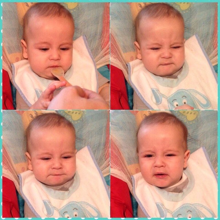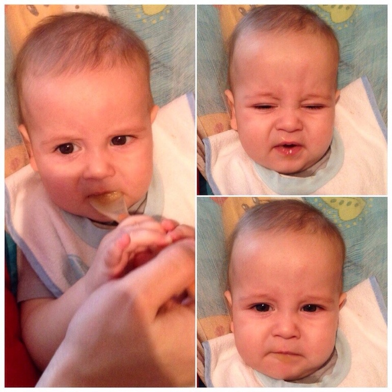 Так сынуля обрадовался, когда дали ему наконец то свою тарелку и ложку! И какое же было разочарование, когда он попробовал эту гадость))) Но все съел, морщился, но, почему то ел. Думал , наверное, дальше будет вкуснее )))