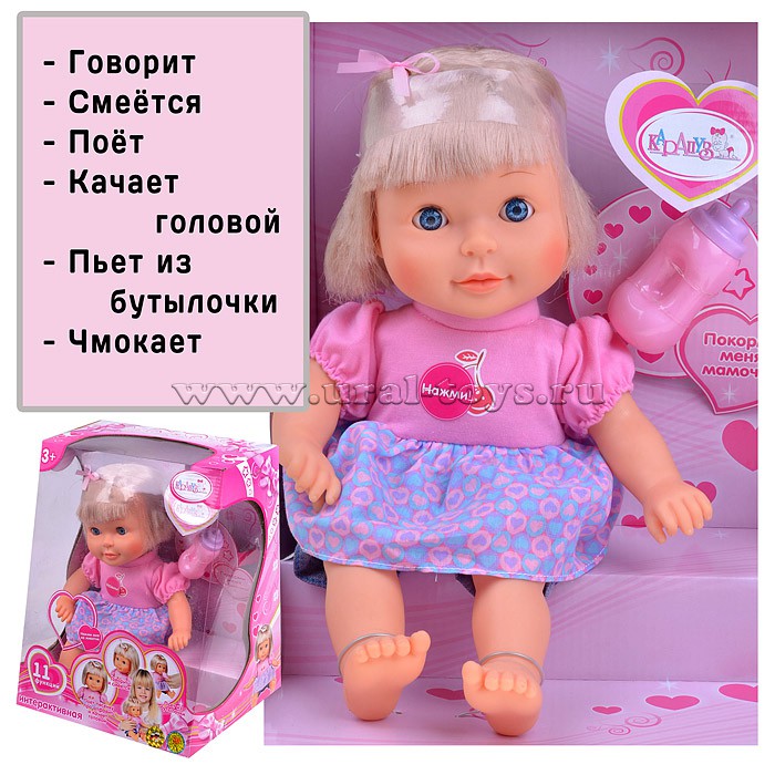 "Карапуз" Кукла 35 см - интерактивная, 11 функций: говорит, поет песенку про алфавит, с бутылочкой. Чтобы начать играть, нажмите на кнопку на груди куклы. Малышка поет песенку про алфавит, задорно покачивая головой в такт песенке. Если малышка проголодалась, то она попросит кушать, покорми ее из бутылочки и она будет есть, аппетитно причмокивая, если забрать бутылочку, когда малышка еще кушает, она скажет: "я еще не наелась", когда она наестся, то срыгнет и скажет: "очень вкусно,спасибо!" В комплект входит бутылочка. - высота куклы: 35 см. |