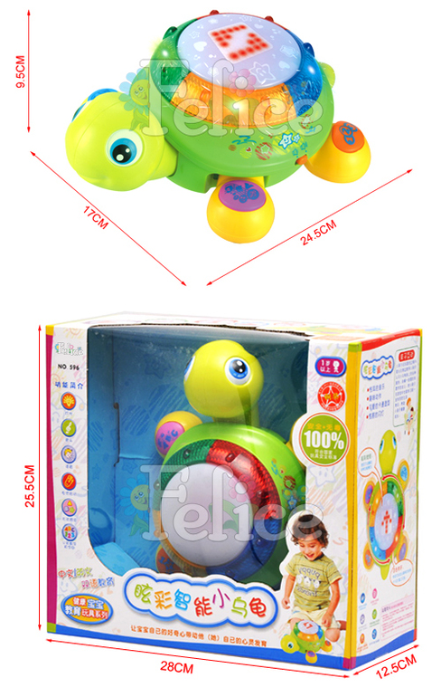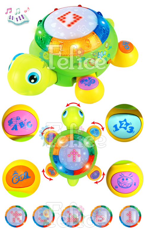 Развивающая интерактивная игрушка с музыкальными и световыми эффектами для детей от 1-го года. Благодаря встроенному моторчику игрушка может ездить самостоятельно. На панцире световое табло, на котором отображаются символы. На лапках звуковые кнопки. Во время движения у черепашки качается голова и двигаются лапки. Игрушка способствует развитию моторики, мышления, изучению цветов и форм, восприятию звуков.