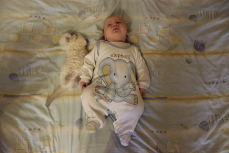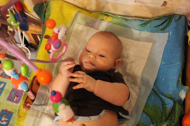 Были засечены три переворота со спины на живот через левое плечо. В последний раз он поворачивался аж с визгом, как тяжело ему это давалось) но, насколько я поняла, он это прям осознанно делает, в первый раз удивился от полученного результата, а сейчас прям хочет перевернуться.