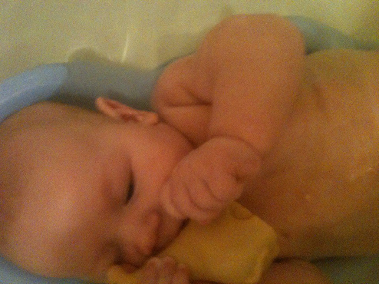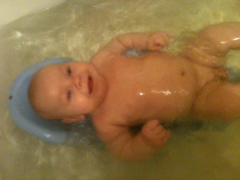 Недавно опробовали покупаться в горке, ему очень понравилось, плескался там как бешеная рыбка, всю воду расплескал из ванны, а потом так развеселился, что аж подпрыгнул, оторвал попу от горки и поплыл на спине вперед...вперед и под воду)) но, благо, мы уже умеем нырять, не испугался и даже не заплакал.