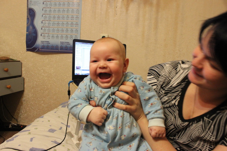 Вообще, весельчак такой стал, рассмешить его очень легко, правда не смеется в голос, больше визжит от восторга)