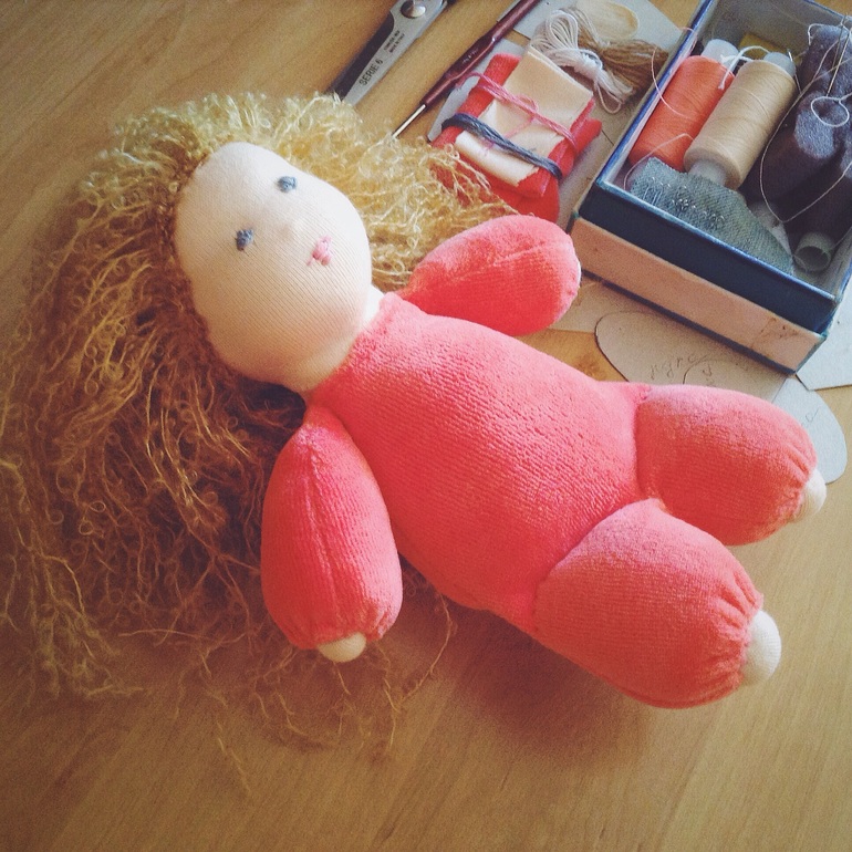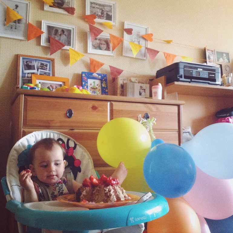К первому дню рождения готовилась сама, почти ничего не покупали: шарики надувала ночью, сделала бумажные флажки, нарисовала картинку, приготовила несложный тортик (взбить сметану, сахар и бананы, залить смесью раскрошенное печенье и на ночь в холодильник). В подарок сшила Вере небольшую вальдорфскую куколку по мастер классу с Ярмарки Мастеров, очень мне понравился процесс, хотя сидела почти неделю по ночам. День рождения отметили дома, а потом съездили на пикник с бабушкой и дедушкой, пожарили шашлыки. Вера угощения все в основном размазала по рукам, только клубничку и вишенки съела, зато воздушные шарики это полный восторг!