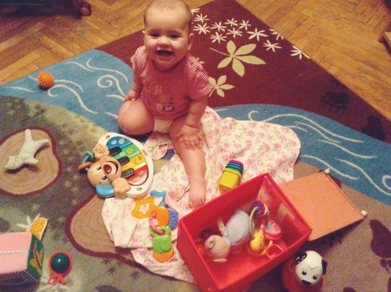 Я удивляюсь, еще совсем недавно Вера только лежала и требовала, чтобы ее взяли на ручки, а тут вдруг так резко стала самостоятельная: сидит посреди комнаты на коврике и разбирает гору своих игрушек. Любимое положение уже как месяц - стоять на колешках и раскачиваться взад-вперед. Теперь научилась сама садиться: когда стоит на колешках поджимает одну ножку под себя и плюхается на попу. Еще нравится выпрямлять ноги, когда стоит на коленях, и торчать попой кверху. Потихонечку начинает ползать, но пока не по всей квартире, а только по важному делу: например, если в поле зрения появляется пакет, который мама не разрешает грызть, или мяч укатился, то Вера может доползти до интересующего предмета на коленях. С ужасом жду, когда она распробует этот новый навык, так как квартира у нас маленькая, а вещей и углов куча.