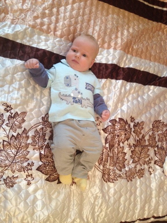 прививку нам не сделали - опять старшая с соплями. Кушаем - спим хорошо. Интервал 3.5-4 часа, ночью спит по 6-7 часов без просыпания на еду. Поспать вообще любит) играет в коврике, качелях, стульчике : ручками бьет по игрушкам, ножками пинает, еще ему нравиться веревочки и ленточки и этикетки у игрушек - за них хватаеться. Голову держит хорошо, но на животе не любит лежать - пытаеться бултыхнуться на бог. Всем улыбаеться, агукает! Растет тусовочным - на площадки все (друзья само собой) хотят с ним побрлтать, особенно старшие детки. Гуляли когда тепло было по 4 часа 2 раза вдеть, а то и больше.