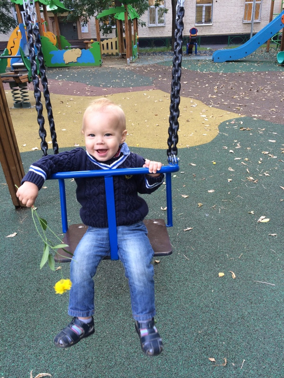 как все дети в этом возрасте Платон очень любит качели. Я тоже очень любила в детстве...пока сильно не упала. но это другая история.