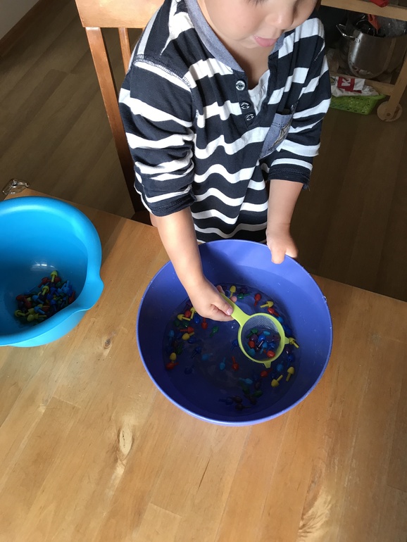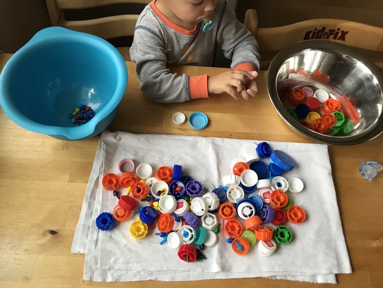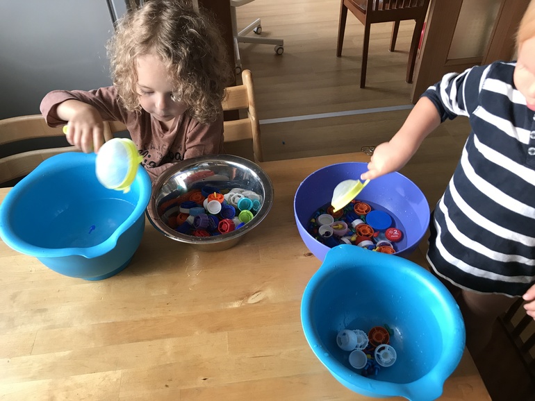 ну а это секундная в смысле времени подготовки развлекуха для Платона, но заняла его надолго. он вылавливал а потом высыпал эти штучки обратно много-много раз. пока не прибежал Лука и не потребовал себе тоже такую игру. пришлось насыпать ему крышек