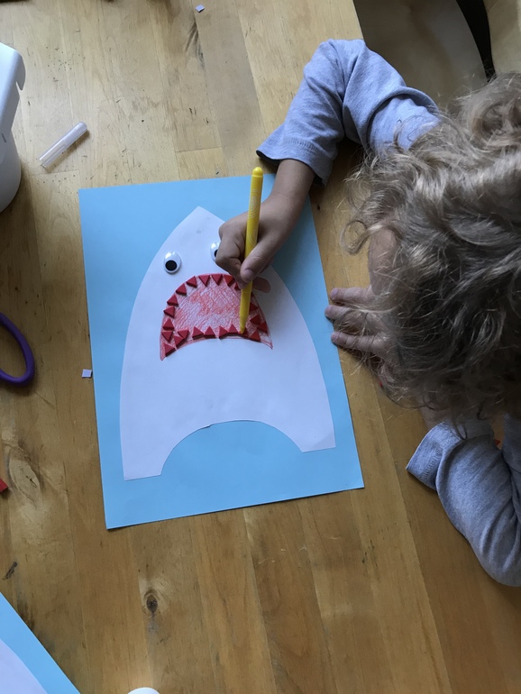 Белые зубы мне вырезать было лень, поэтому в ход пошли готовые клейкие треугольники. Лукень пытается их перекрасить, ага ))